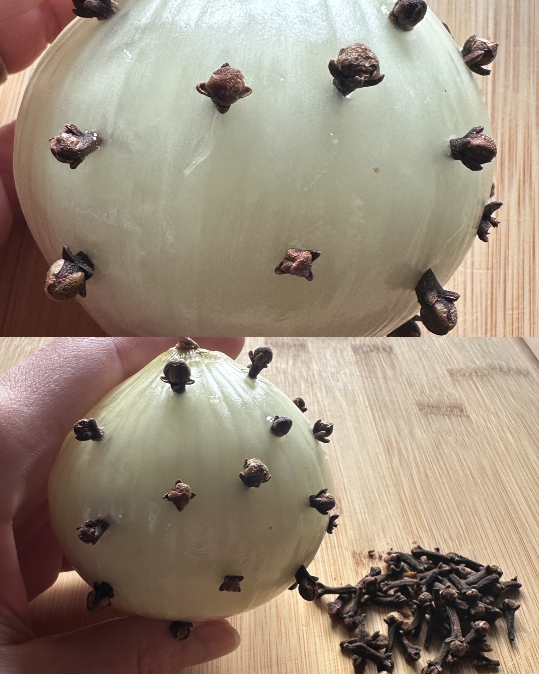 • • A clove-studded onion can be used as a natural deodorizer. Placing one in your kitchen or living room helps neutralize bad odors. This was a common practice in older households before the advent of synthetic air fresheners.