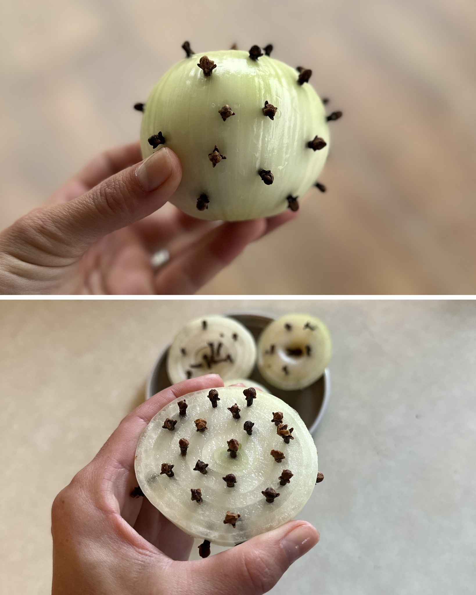 • • A clove-studded onion can be used as a natural deodorizer. Placing one in your kitchen or living room helps neutralize bad odors. This was a common practice in older households before the advent of synthetic air fresheners.