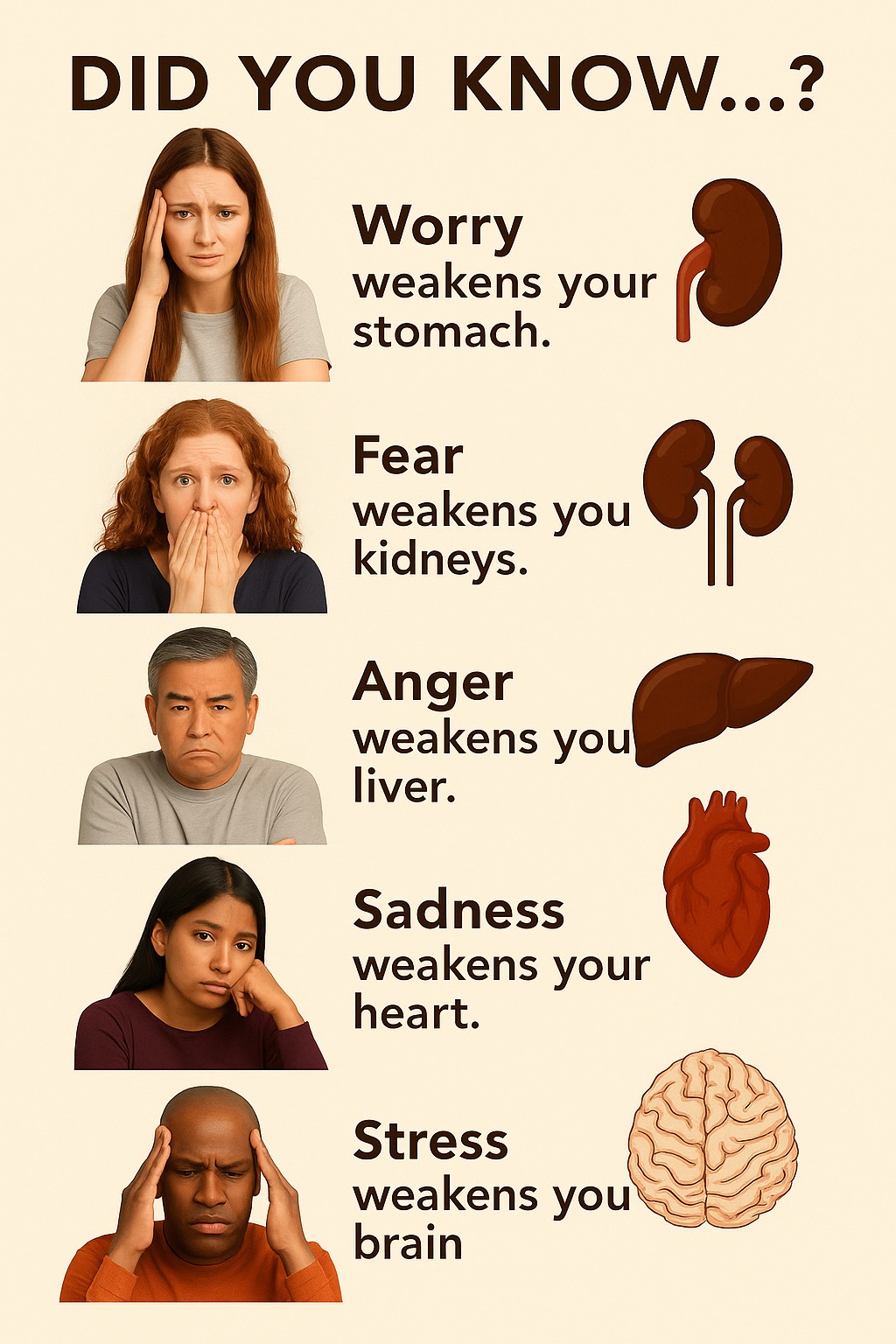 Emotions are deeply connected to your body. Ancient traditions and modern science show that every feeling you experience can affect specific organs, sometimes strengthening them, but often weakening them if the emotion is too intense or prolonged.