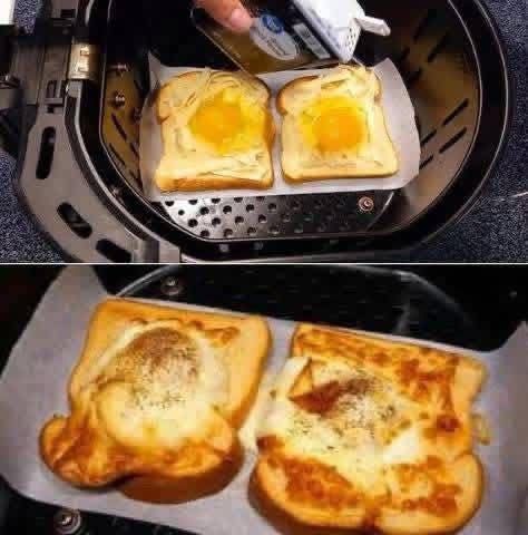 Preparation time and intensityPreparation time : 5 minutesCooking time : 8 minutesDifficulty : EasyIngredients (for 1 serving)1 slice of bread1 egg1 teaspoon of olive oil or a knob of butter (optional)Salt and pepper to tasteOptional toppings: avocado, grated cheese , fresh herbs, etc.InstructionsPrepare the breadTake a slice of bread and make a small hole in the center using a cookie cutter or a glass.Prepare the air fryerPreheat your air fryer to 180°C (350°F) for 2 minutes.Assemble the toastPlace the slice of bread in the air fryer basket.Lightly brush the bread with olive oil or butter to make it crispy (optional).Crack the egg and gently pour it into the hole in the bread. Season with salt and pepper.CookCook in the air fryer for 6 to 8 minutes, depending on the desired consistency of the yolk (barely runny or well cooked).ServeRemove the toast from the fryer with a spatula. Add your choice of toppings such as avocado slices, grated cheese, or fresh herbs.Serve immediately.Nutritional information (per serving)Calories: 180 kcalProtein: 10gCarbohydrates: 15 gLipids: 8 gFiber: 1 gSugar: 1 gSodium: 200 mg