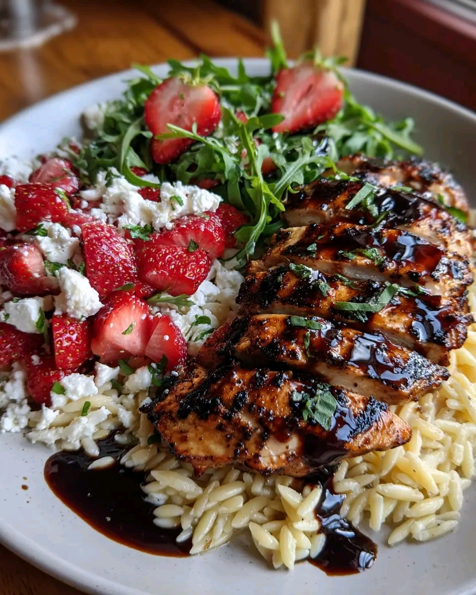 Whether you’re cooking for your family, meal prepping for the week, or hosting a backyard dinner, Grilled Chicken with Strawberry Balsamic Glaze and Ricotta Salata Orzo Salad delivers a full experience in one gorgeous plate.