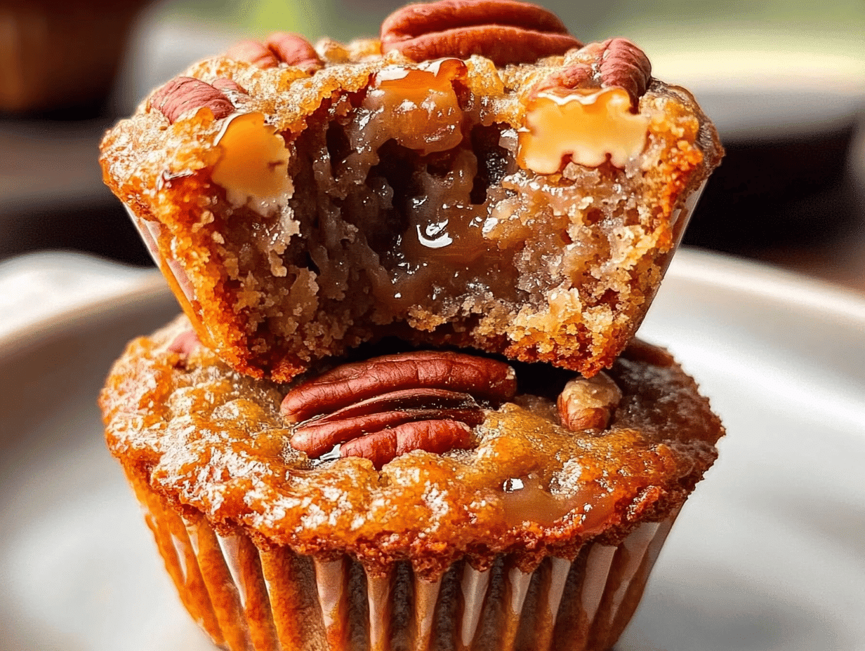 Optional topping – About 15 minutes into baking, you can pull them out and place a pecan half on top of each muffin, then return to finish baking. This is purely for looks.