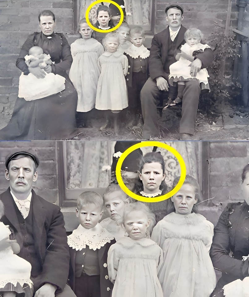 Imagine finding an old family photograph, faded and yellowed by time. A seemingly ordinary image: a father, a mother with a baby, and four well-behaved children in front of a brick wall. Nothing special… Until, after digital restoration, a detail emerges.
